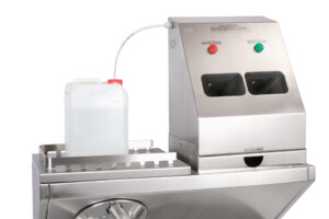 When passing towards the protected area, the worker does not pass without disinfecting his/her hands. The built-in system responds to the simultaneous insertion of both hands into the interior of the device, where aerosol spraying automatically takes place. If the tent procedure is followed, a green light will illuminate, releasing the turnstile and allowing the worker to pass.