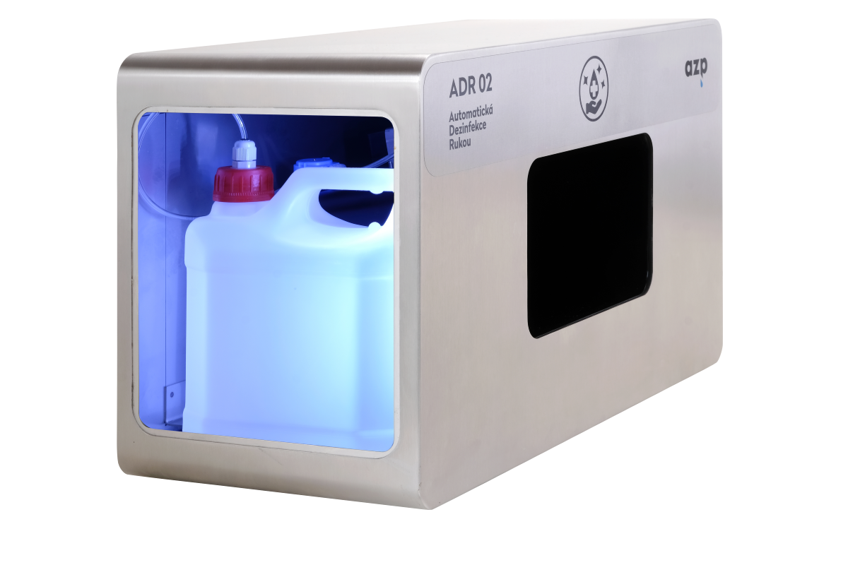 In the public areas, it is not possible to use the pump of the disinfection container. The system works without contact when the hand is inserted, the sensor detects movement and the dose of disinfectant solution is sprayed on the hand. The dose can be set in the service mode in the range aprox. 0.3-1.5ml. Production set up: aprox. 0,4 ml - Ensure longer and maintenance-free operation time.