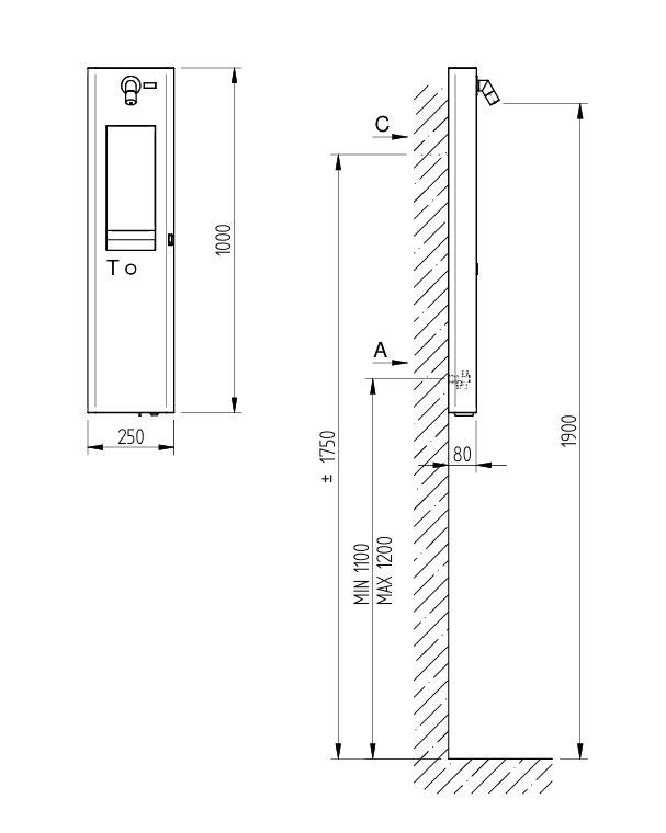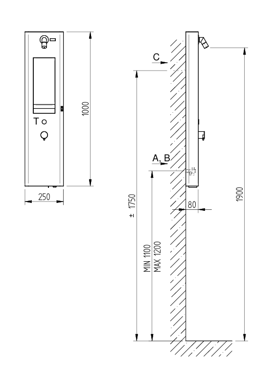 - Installation of ZAS does not need any particular construction setting. Its construction enables connection on to existing water inlets with spacing from 90 to 160 mm, at the height of aprox. 1200 mm (as per picture).