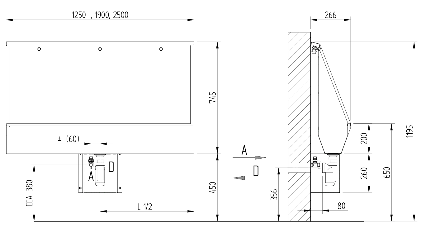 The troughs are manufactured in 3 basic standard widths. Other widths can be supplied on request according to your needs, the maximum possible width is 2500 mm. The trough is typically designed with a waste in the center of the trough. The waste siphon is protected by a cover.